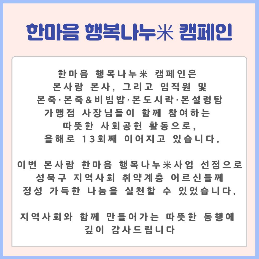본사랑 한마음 행복나누米 캠페인은 본사랑 본사와 임직원, 그리고 본죽, 본죽&비빔밥, 본도시락, 본설렁탕 가맹점 사장님들이 함께 참여하는 따뜻한 사회공헌 활동입니다.