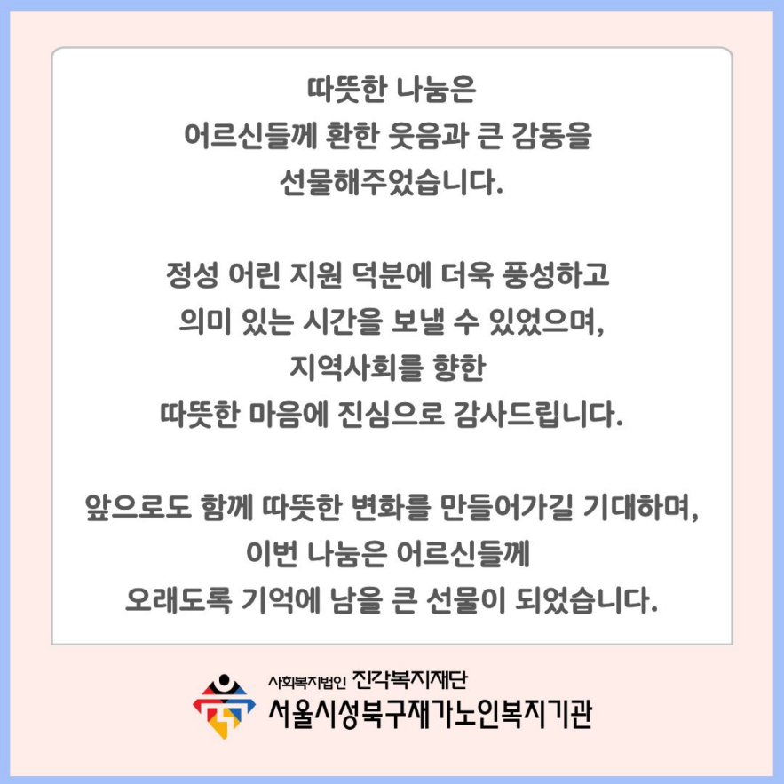 앞으로도 성북구재가노인복지기관은 지역사회와 협력하며, 어르신들의 행복한 일상을 위해 최선을 다하겠습니다.