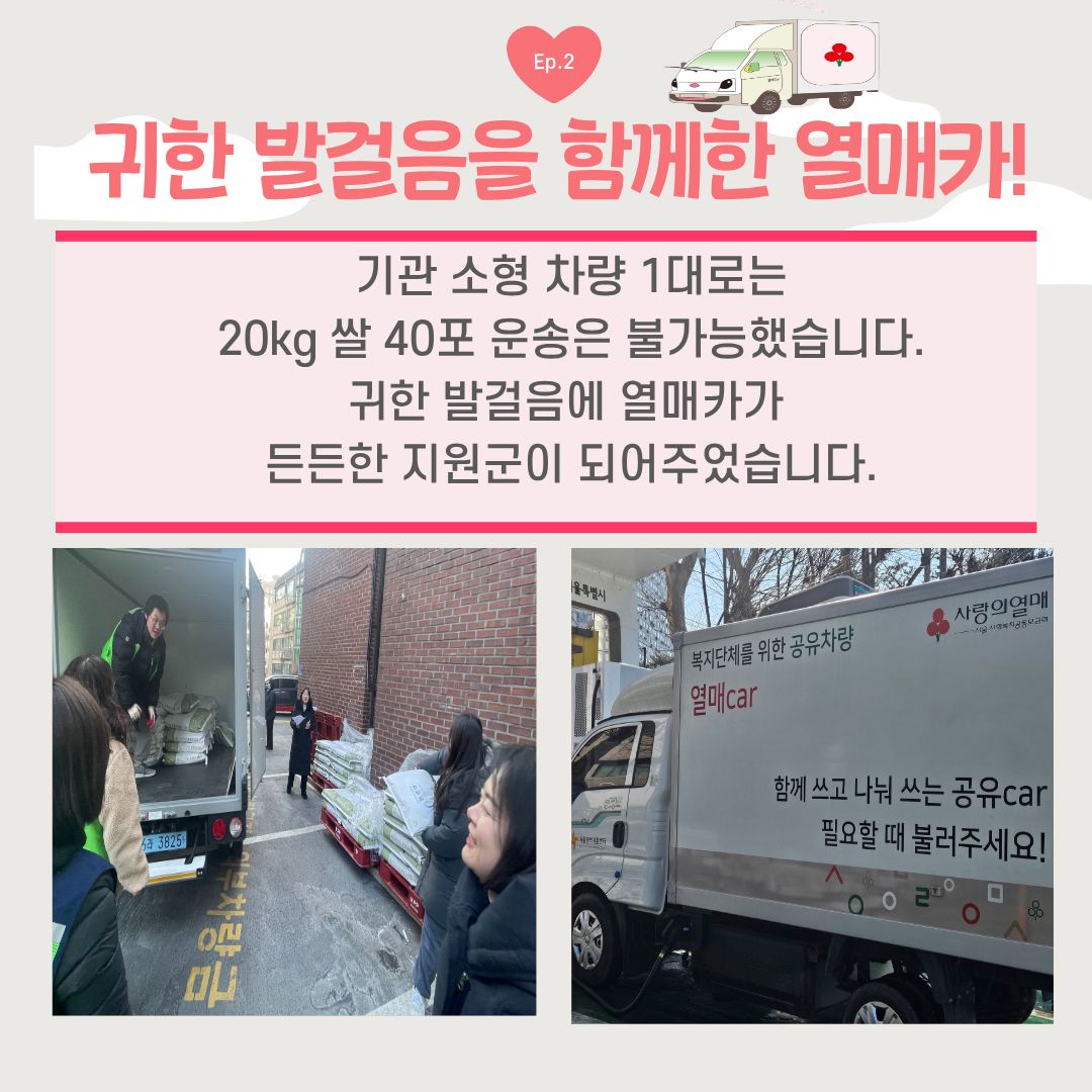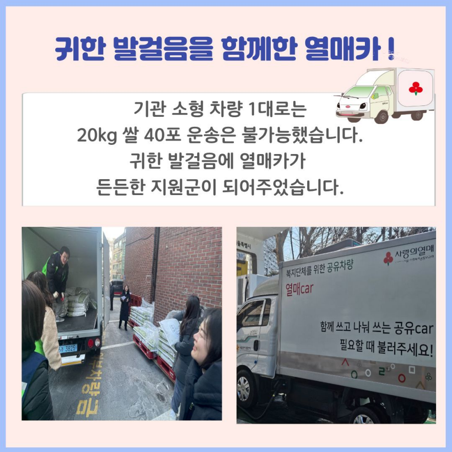 또한, 기관은 소형 차량 1대로는 쌀 40포를 한 번에 운송하기 어려운 상황이었으나, 든든한 지원군이 되어준 열매카의 도움으로 안전하고 신속하게 운송을 완료할 수 있었습니다.
