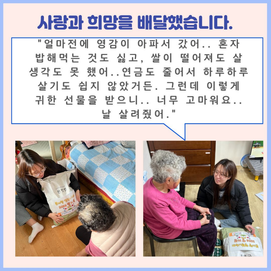 이번 나눔은 단순한 식료품 지원을 넘어 어르신들께 따뜻한 마음과 희망을 전할 수 있는 소중한 시간이되었습니다.