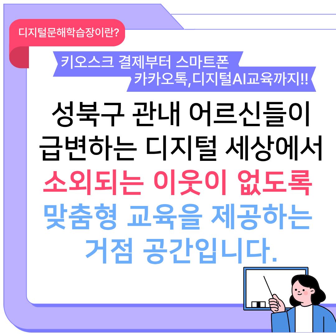 앞으로도 우리 기관은 성북구 어르신들이 디지털 환경에서 소외되지 않고 일상 속에서 스마트기기를 활용할 수 있도록 실질적인 디지털 문해 교육을 지속적으로 운영할 예정입니다.