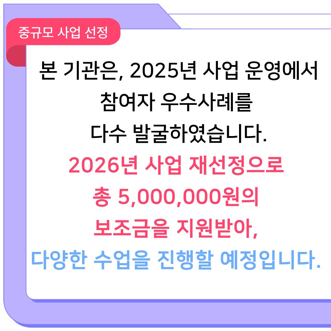이러한 노력과 성과를 바탕으로 올해는 중규모 기관으로 선정되었으며, 총 500만 원의 사업비를 지원받게 되었습니다.