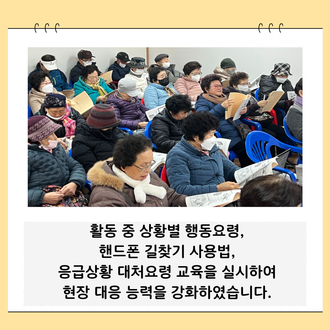 참여 어르신들은 교육에 적극적으로 참여하며 안전에 대한 중요성을 다시 한번 인식하는 계기가 되었고,