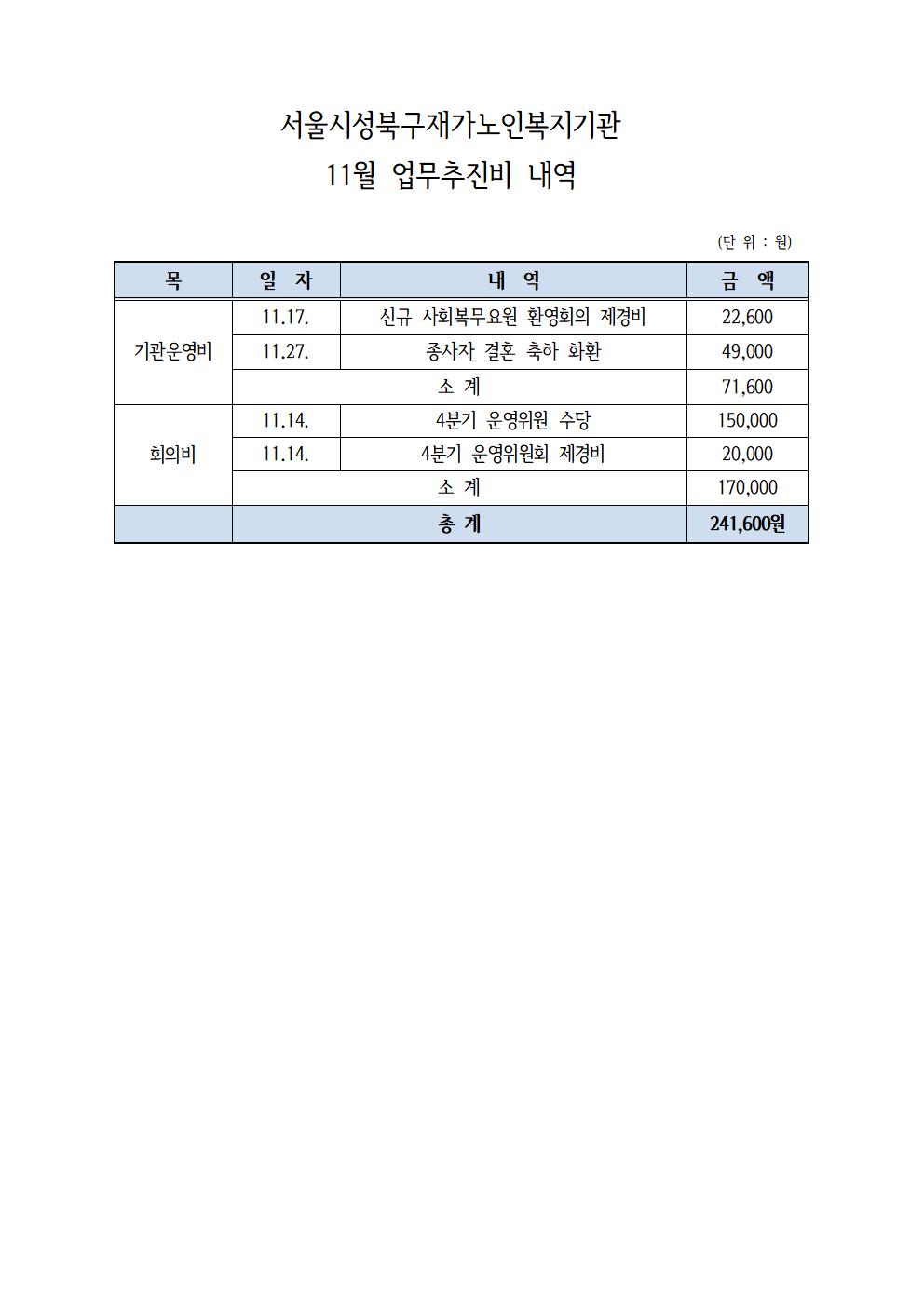서울시 성북구 재가노인복지기관에서는 2025년 11월 업무추진비 사용내역을 공지합니다.
