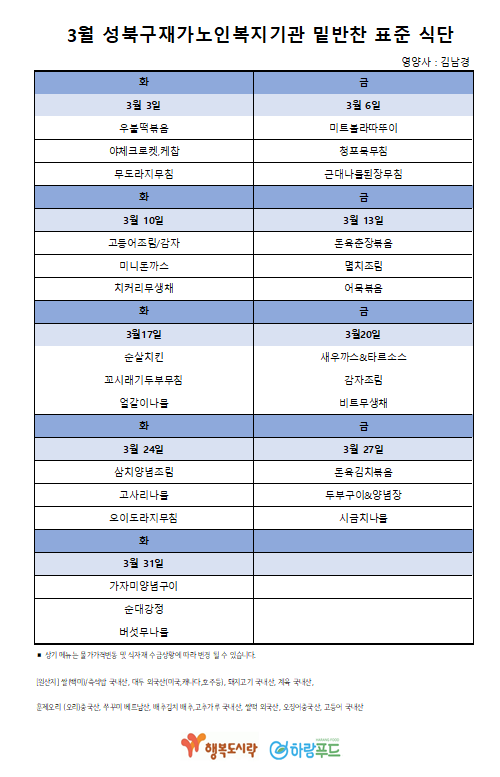 2026년 밑반찬 3월 식단표