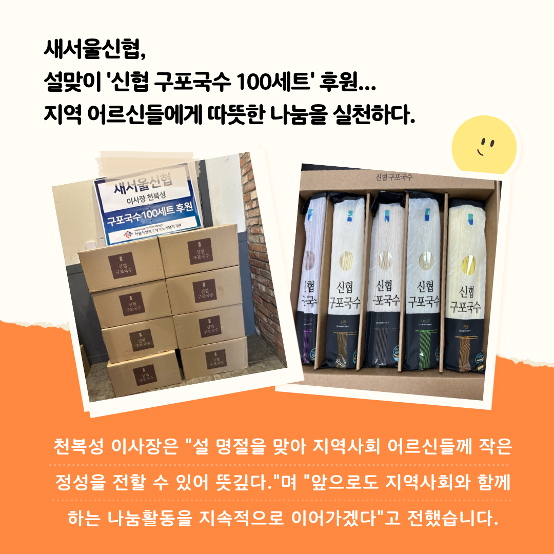 새서울신협(이사장 천복성)은 설 명절을 맞아 지역사회 어르신들을 위해 구포국수 100세트를 후원하며 따뜻한 나눔을 실천해 주셨습니다.