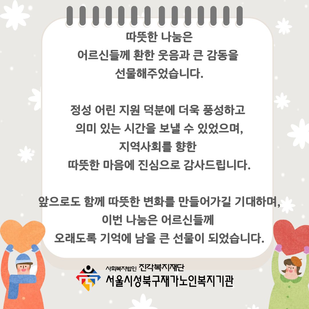 앞으로도 성북구재가노인복지기관은 지역사회와 협력하며, 어르신들의 행복한 일상을 위해 최선을 다하겠습니다.