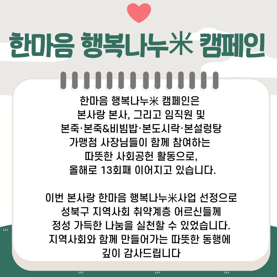 서울시성북구재가노인복지기관은 올해로 13회를 맞이한 본사랑 한마음 행복나누米 캠페인을 통해 지역사회 어르신들께 따뜻한 나눔을 전할 수 있었습니다.